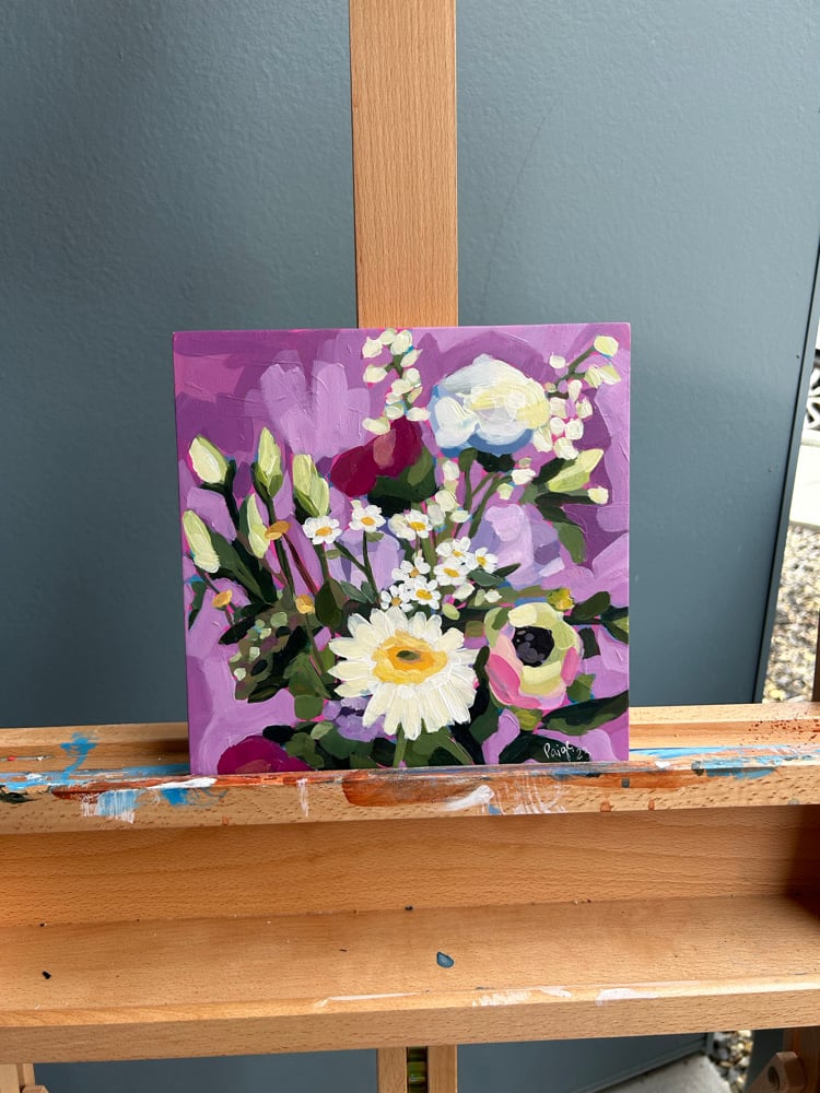 This is an original acrylic painting on wood panel, painted by me! I am inspired by flowers and bright colors.